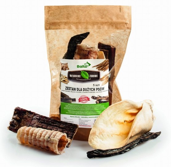 W skład zestawu wchodzą takie wołowe rarytasy jak: ucho wołowe, tchawica wołowa, przełyk, wątroba - łącznie aż 5 sztuk!