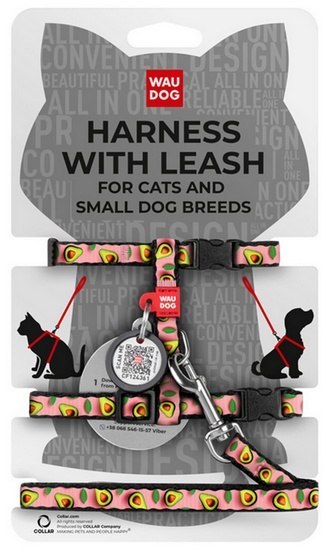 Collar WauDog Nylon Szelki ze smyczą nylonowe anatomiczne w kształcie litery H, z QR-paszportem, plastikowy fastex, wzór AWOKADO