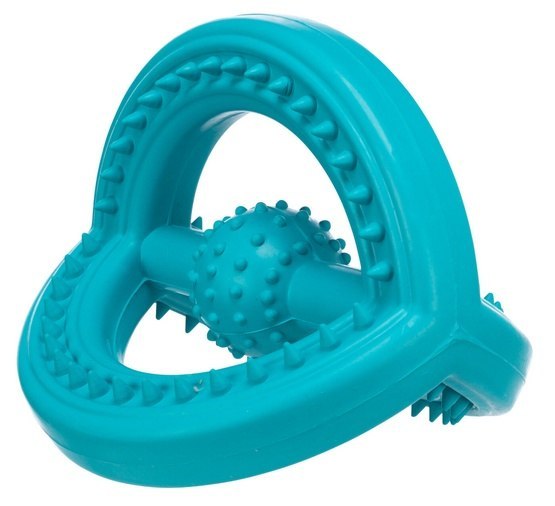 Zabawka wykonana z naturalnej gumy. Nieregularne kształty piłki masują dziąsła psa podczas zabawy i czyszczą kamień nazębny.